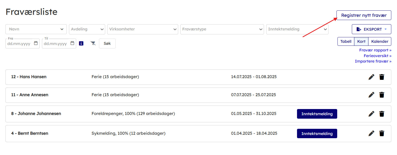- Alternativt kan Lønnsfører registrere fraværet på vegne av de ansatte. Gå til Ansatte → Fraværliste → Nytt fravær