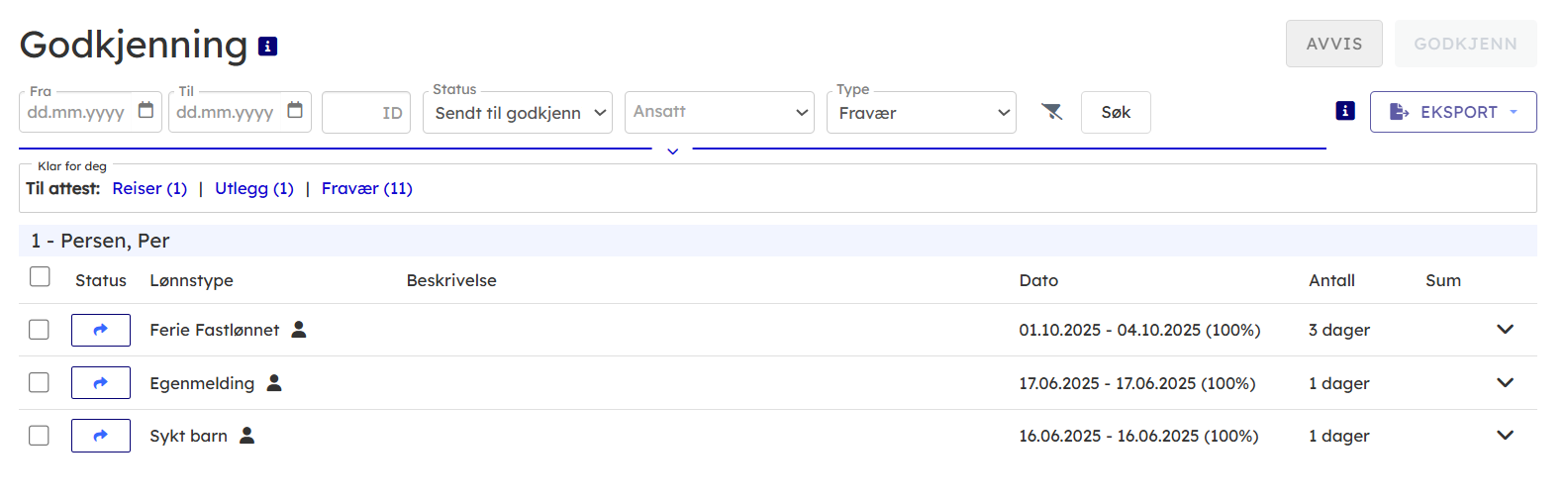 - Attest siden viser de ansatte man har tilgang til å se. Filtrer listen etter behov.