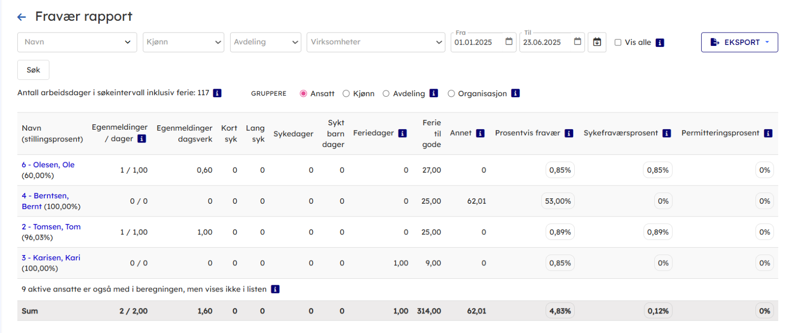 - Vis rapporten pr. Avdeling, kjønn, ansatt og org enhet