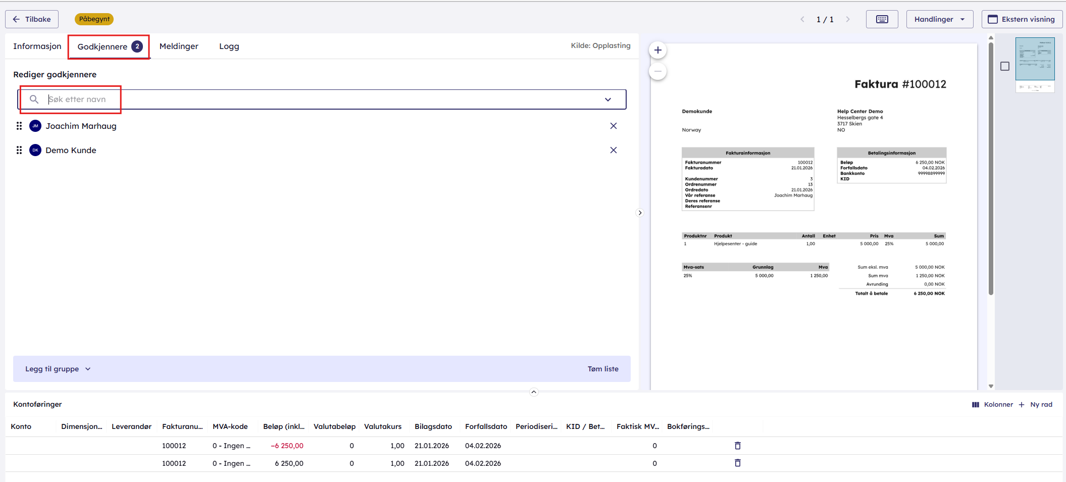 I denne artikkelen går vi gjennom hvordan du legger til godkjennere på et inngående bilag, slik at bilaget sendes til godkjenningsflyt til én eller flere godkjennere.
