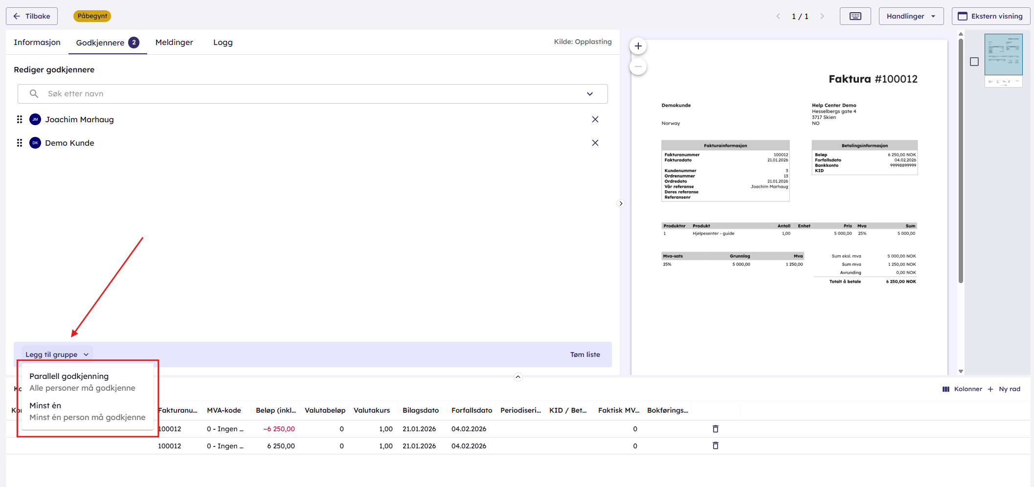 Personer som legges til i en gruppe av type “minst én” blir alle varslet samtidig, og kan godkjenne bilaget samtidig. Det er tilstrekkelig at én av disse personene godkjenner bilaget for at det skal gå videre til bokføring.Slik gjør du det: