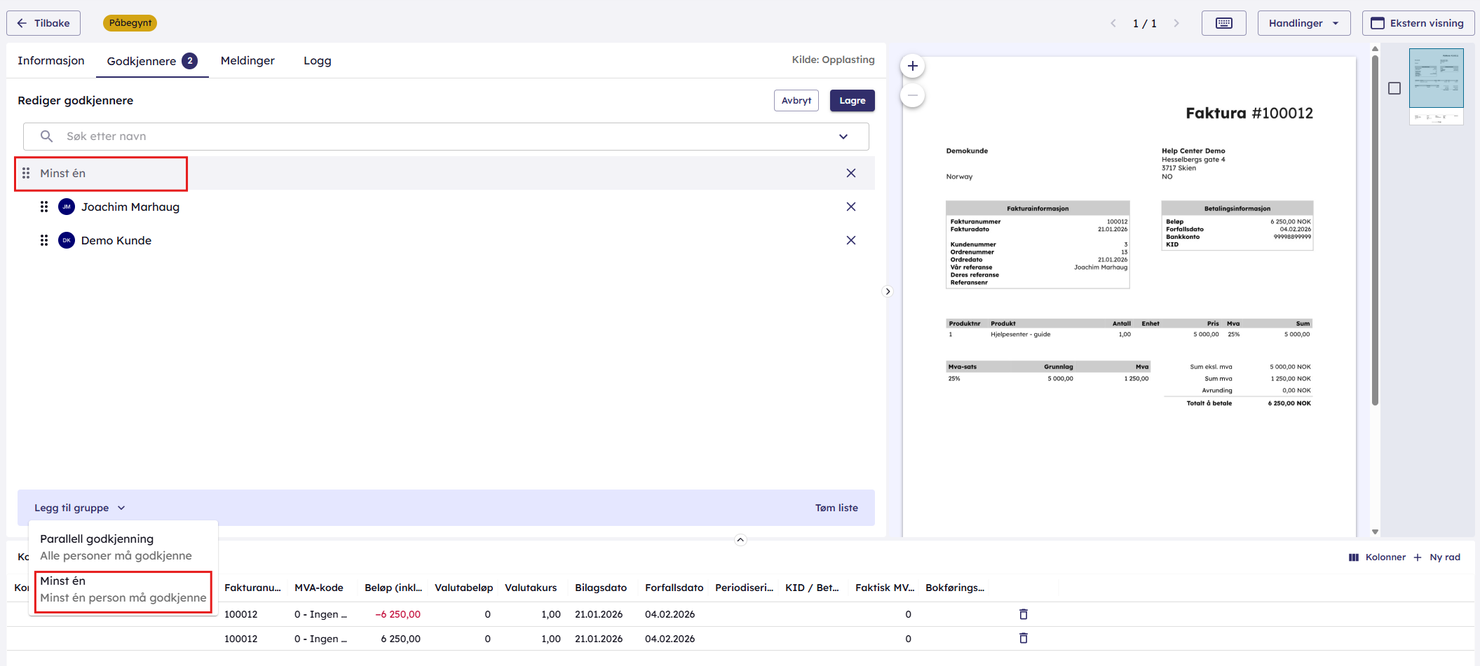 Minst en godkjenning betyr at kun en i denne listen må godkjenne bilaget for at godkjenningsflyten skal fullføres.