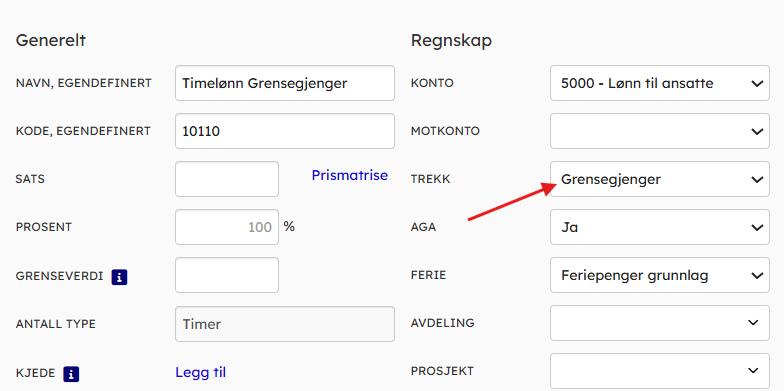 - Gå til Administrasjon - Innstillinger - Lønnsarter og velg lønnsarten du ønsker å kopiere. Trykk Lag Kopi og gjør tilpasninger. Her er det viktig at det legges på “Grensegjenger” i feltet for Trekk.