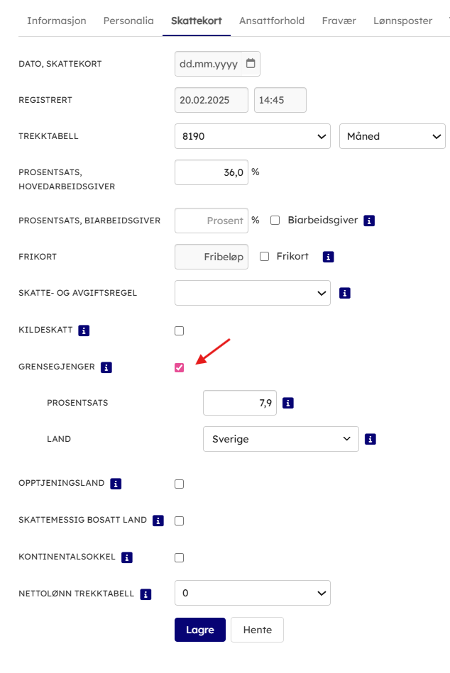 - Gå til skattekortfanen på den ansattes ansattkort. Huk av for grensegjenger om ikke dette er registrert ved henting av skattekort. Prosentsats og land må legges inn. Trykk lagre.