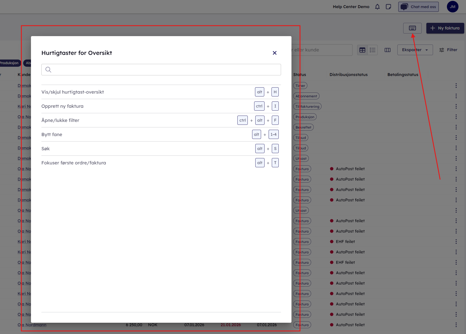 Hurtigtaster er tastatursnarveier som lar deg navigere og utføre handlinger raskere i faktureringsmodulen - uten å bruke musen.