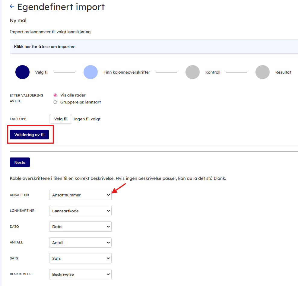 2. Last opp filen du får ut fra timesystemet og validér filen.