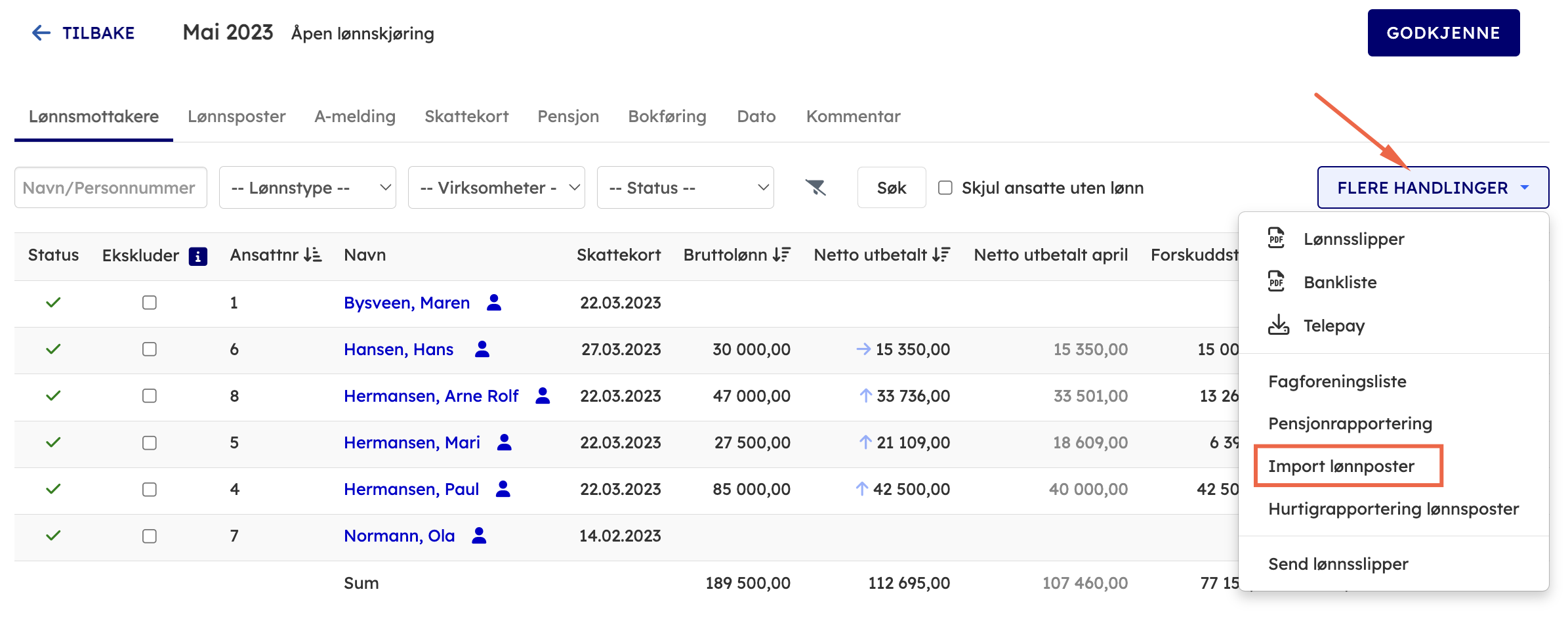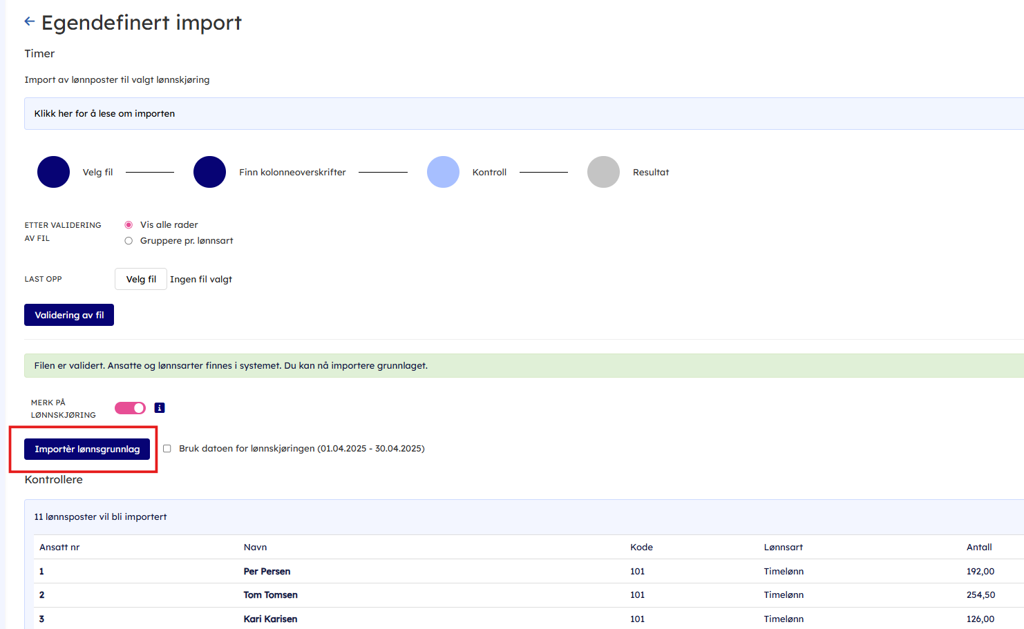 5. Gjør en kontroll og importér lønnspostene over til lønnskjøringen.