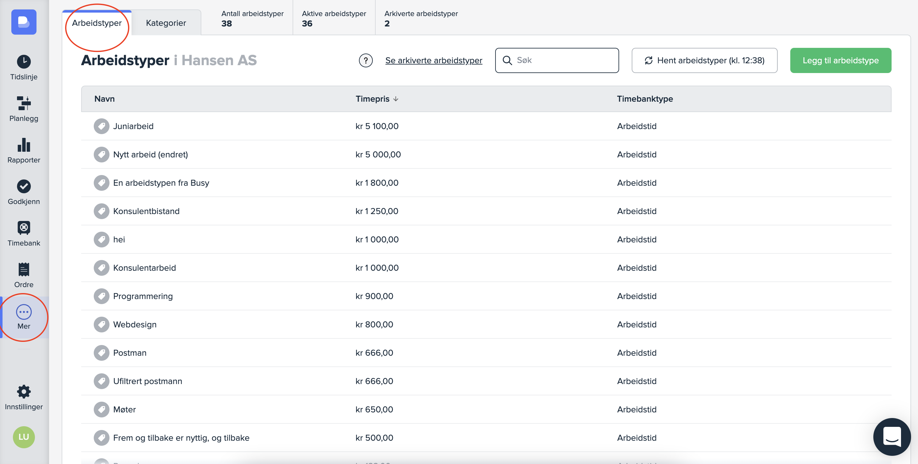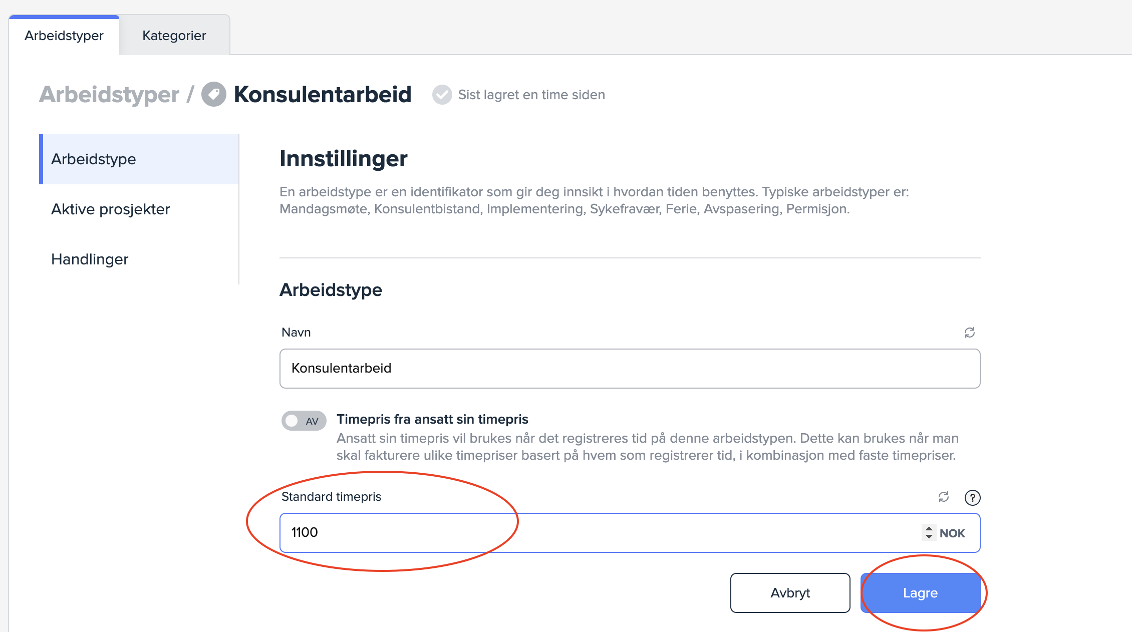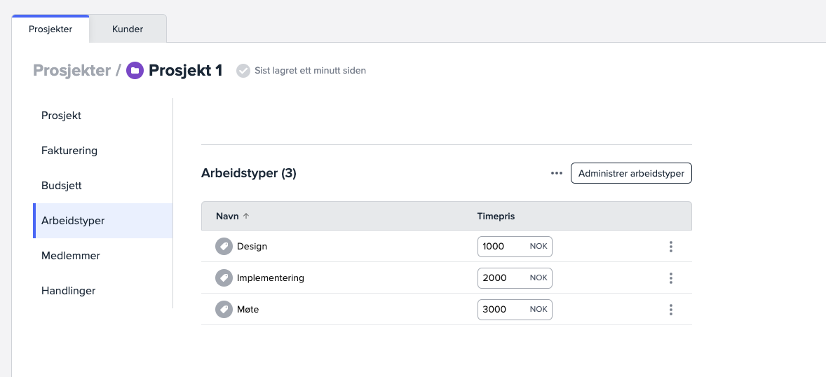 Dersom du styrer prosjektenes timepriser per arbeidstype, kan du justere eksisterende og nye priser inne på hver arbeidstype.