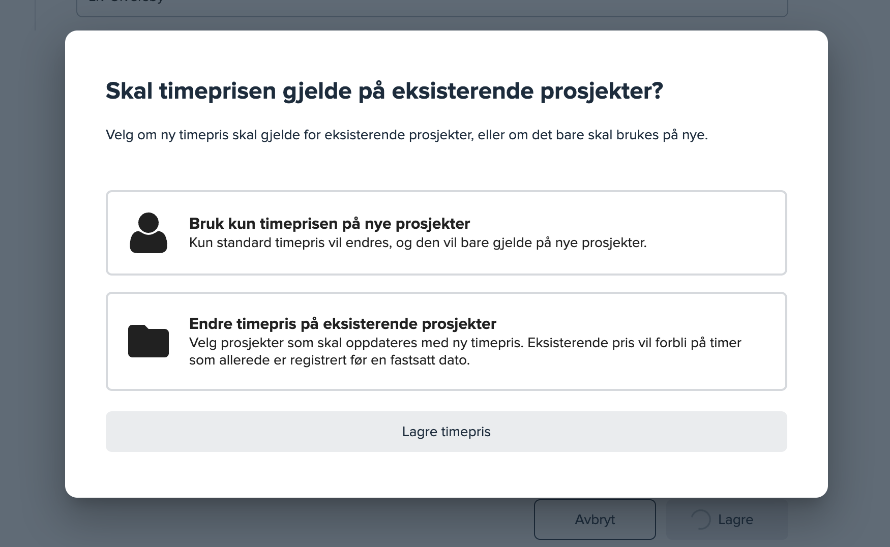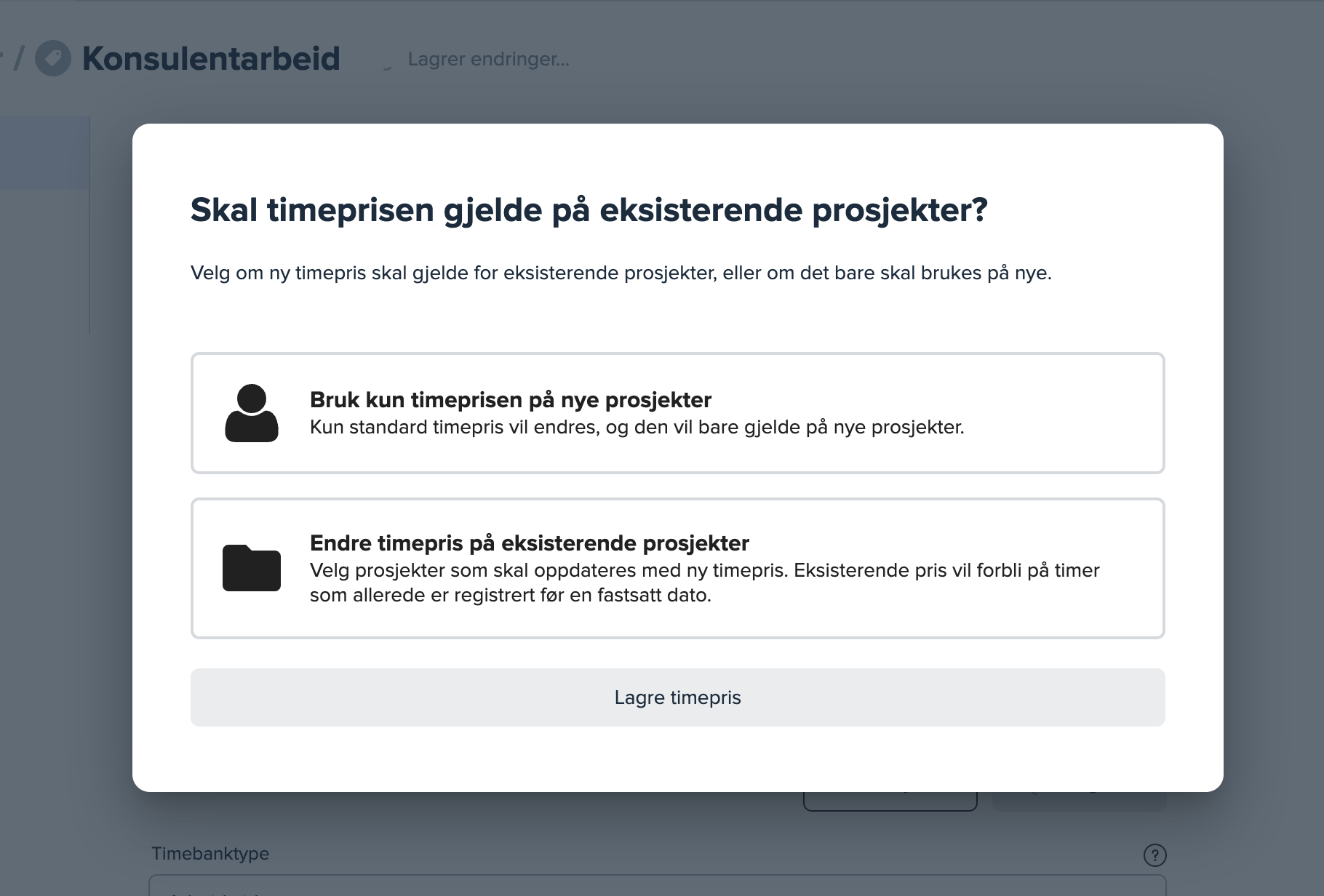 Hvis du skriver inn en ny timepris inne på den enkelte brukeren og trykker «Lagre», vil du få opp et vindu hvor du velger om timeprisen skal gjelde på kun nye, eller også eksisterende prosjekter.