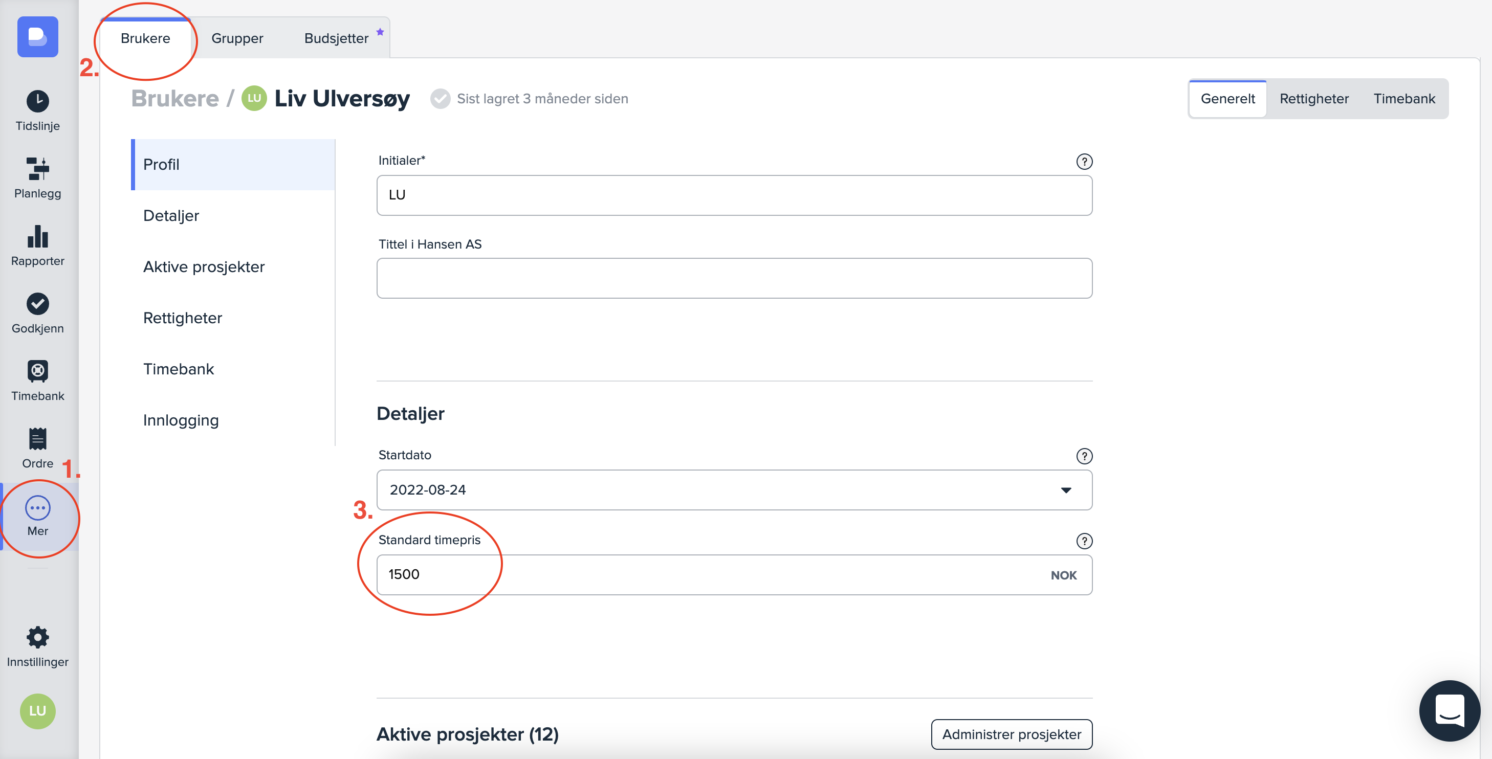Dersom du styrer timeprisene per bruker, kan du gå inn på hver enkelt bruker for å justere eksisterende og nye timepriser knyttet til brukeren.