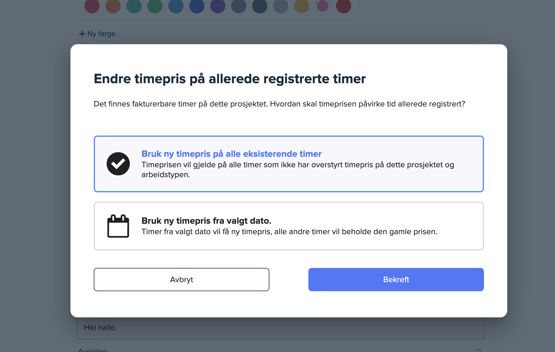 Ved å skrive inn den nye timeprisen på prosjektet og trykke på «Lagre», vil du få opp en fane der du velger om timeprisen skal endres på alle eksisterende timer, eller om den nye timeprisen skal gjelde fra en valgt dato. Timene før denne datoen vil ha den gamle timeprisen.