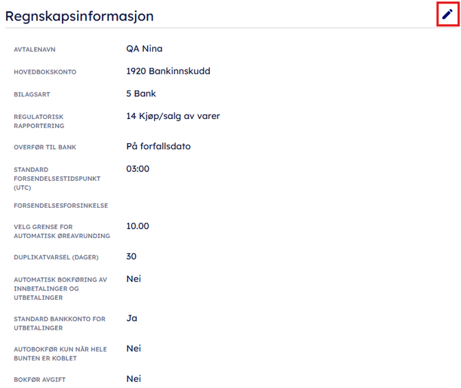 På en eksisterende avtale kan du redigere innstillingene ved å klikke på "Rediger". Deretter klikker du på pennen til høyre for Regnskapsinformasjon for å gjøre endringer på avtalen.