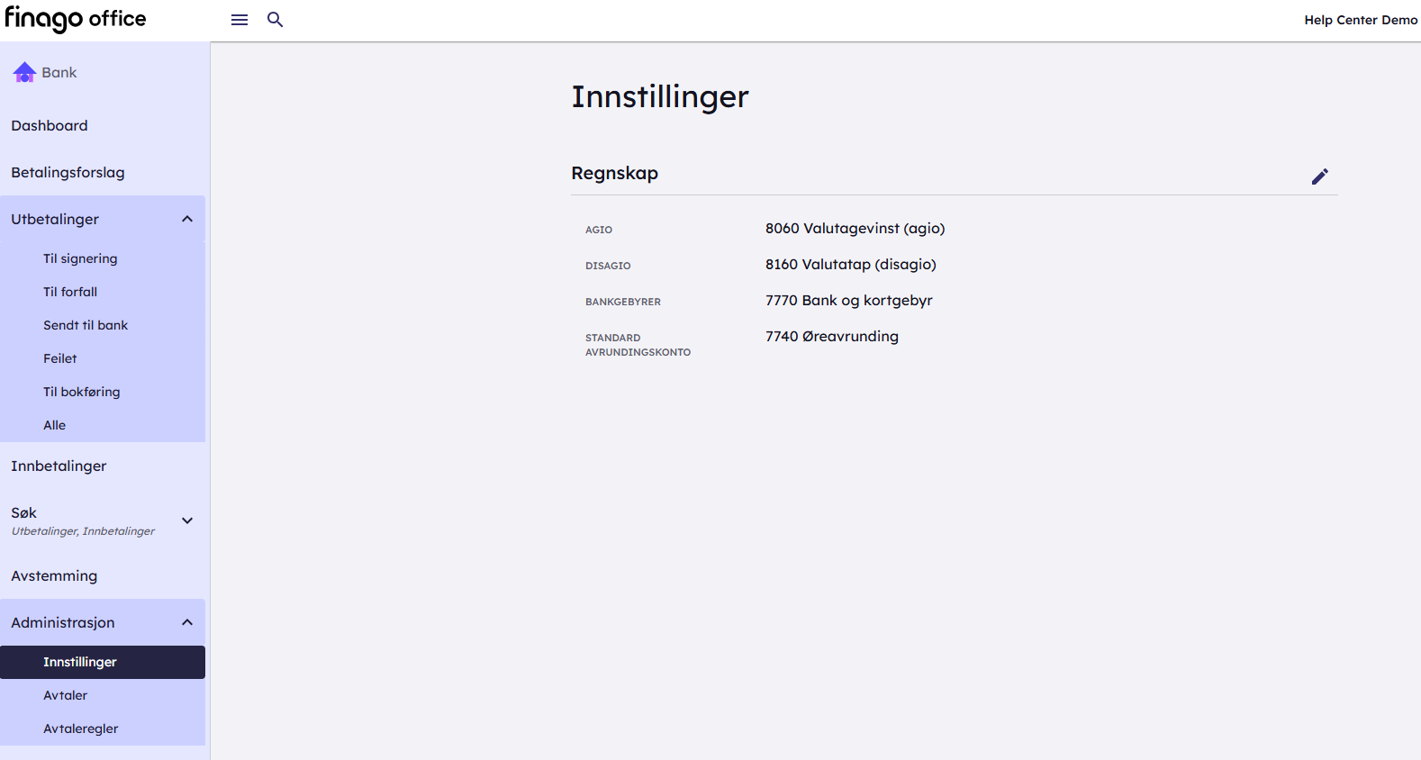 - Under innstillinger setter du opp hvilke kontoer for agio, disagio, bankgebyrer og øreavrunding. Det er disse kontoene som vil bli brukt når det føres betalinger som krever dette. Klikk på pennen for å endre og deretter "X" for å gå ut og lagre.
