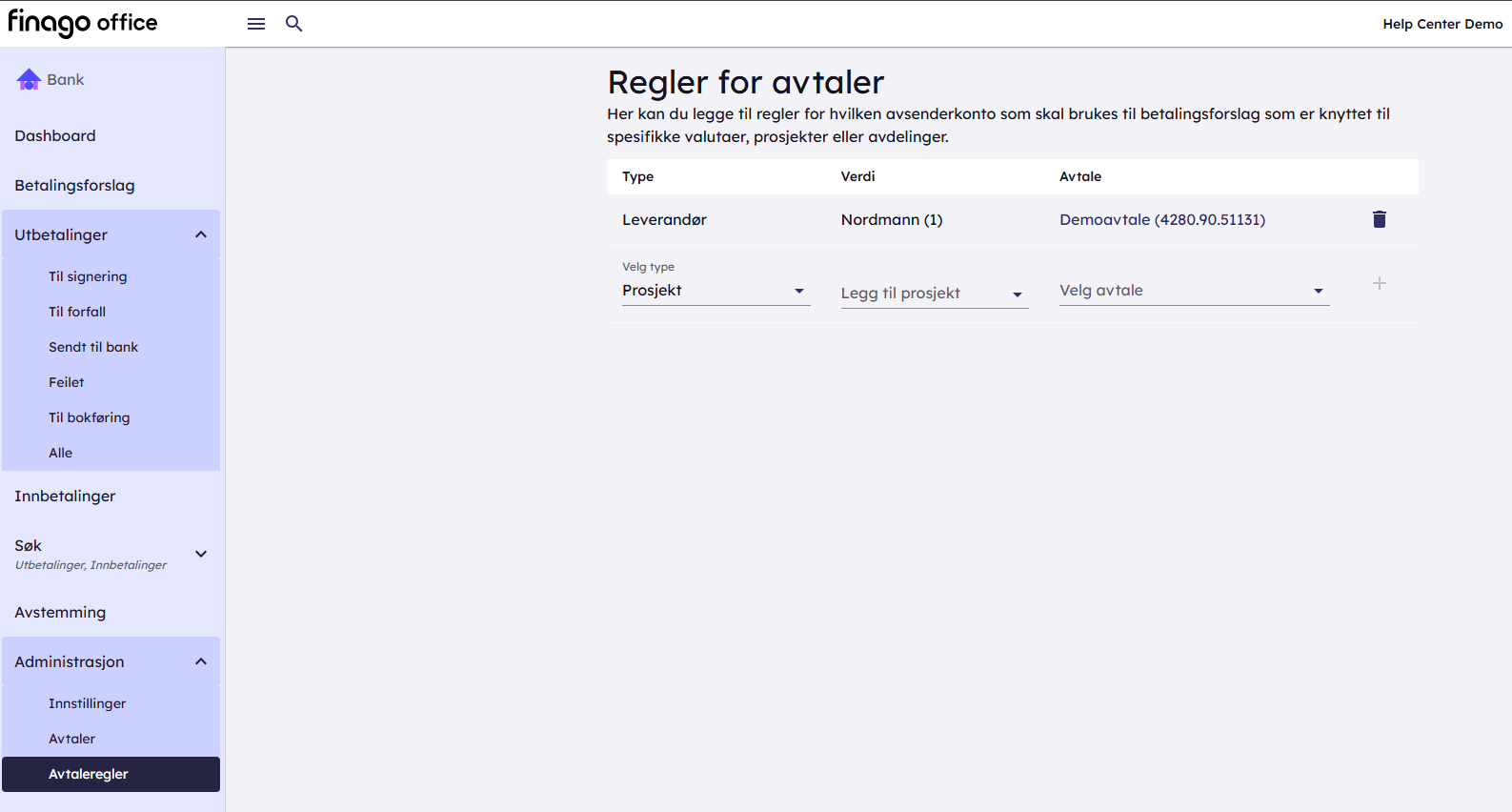 Her kan du legge inn regler for hvilken avsenderkonto som skal brukes til betalinger som er knyttet til spesifikke prosjekter, avdelinger, valuta eller leverandør. Disse vil overstyre det som er satt som standardkonto på avtalene. Du kan lese mer om dette her.