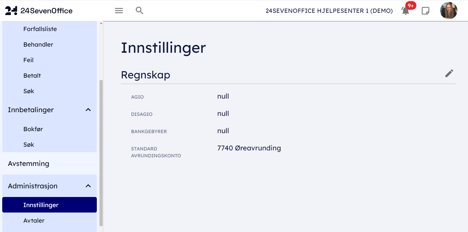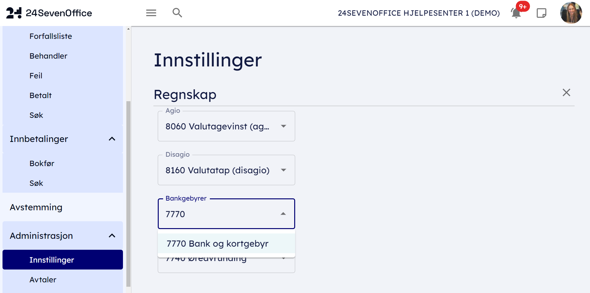 - Under innstillinger setter du opp hvilke kontoer for agio, disagio, bankgebyrer og øreavrunding. Det er disse kontoene som vil bli brukt når det føres betalinger som krever dette.