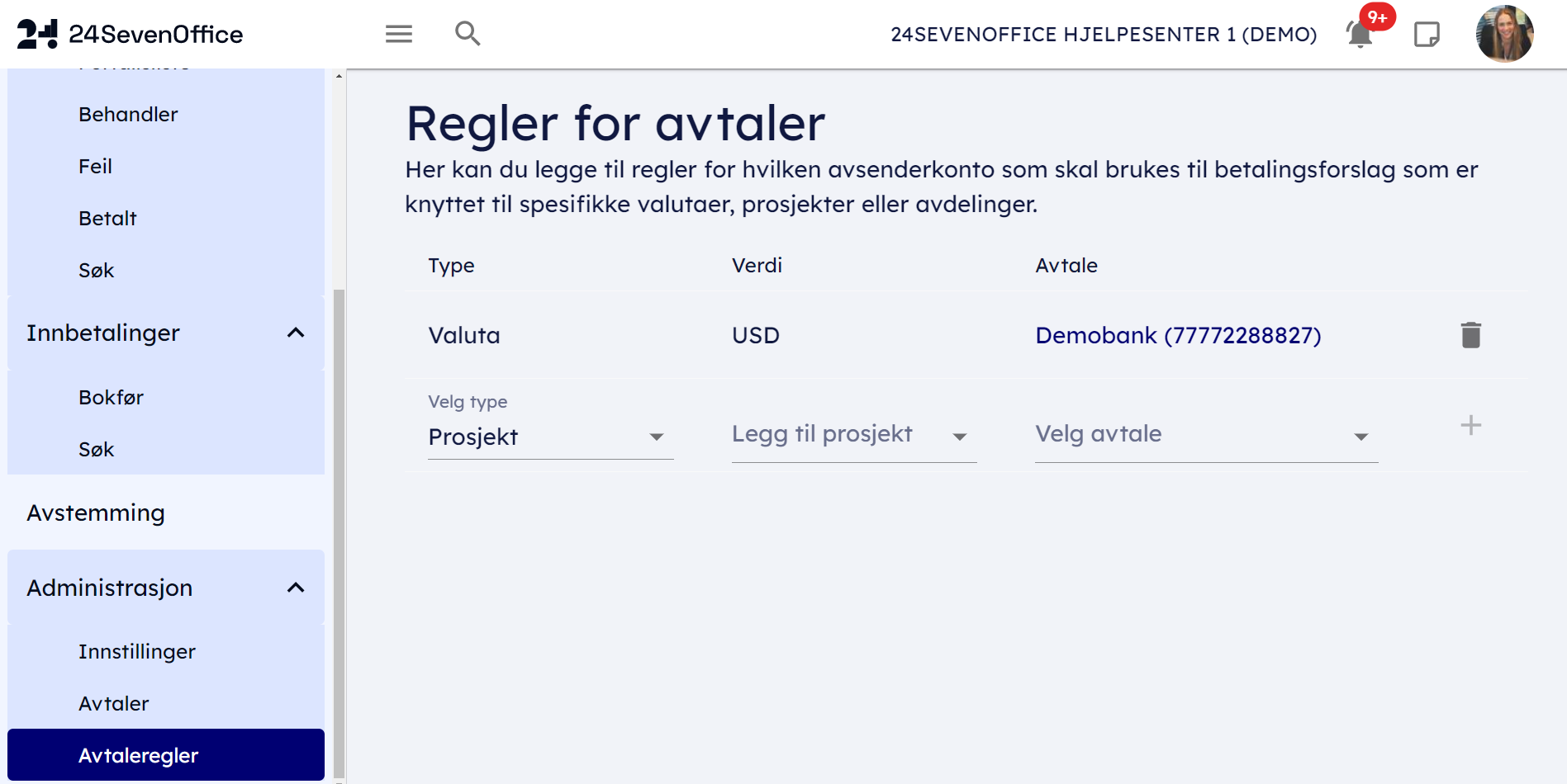 Her kan du legge inn regler for hvilken avsenderkonto som skal brukes til betalinger som er knyttet til spesifikke prosjekter, avdelinger, valuta eller leverandør.