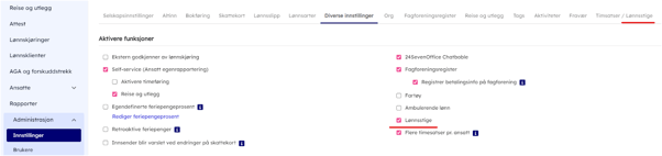 - For å aktivere lønnsstige går til Administrasjon - Innstillinger - Diverse innstillinger og huk av for Lønnsstige.