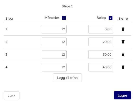- Trykk så på Legg til Trinn. Måneder viser til antall måneder trinnet skal vare. Beløp viser til beløpet. Det er viktig å velge antall måneder som kvalifiserer til neste trinn.