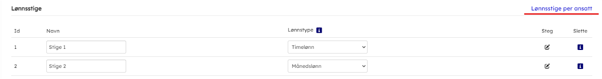 - Opprett lønnsstiger ved å trykke deg inn på Lønnsstige i toppmenyen. Gi stigen et navn og velg lønnstype, her kan du velge timelønn eller månedslønn.