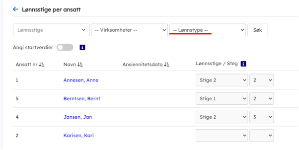 - Når du trykker deg inn på "lønnsstige pr. ansatt” kan du søke på lønnsstige kun for dem med timelønn, kun for dem med månedslønn, eller la være å velge lønnstype, og få frem alle ansatte.
