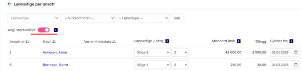 - For å angi startverdier huk av boksen for angi startverdier. Deretter legg inn lønnsstige, steg og evt. dato stigen gjelder fra.