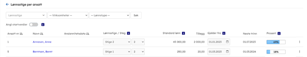 - Man får opp varsel når ansatte avanserer til neste trinn i lønnsstigen. Varselet vises i oversikten over Lønnsstige per ansatt.Status over prosent vil også da stå på 100%. Trykk så på Oppdater alle for å aktivere neste steg.