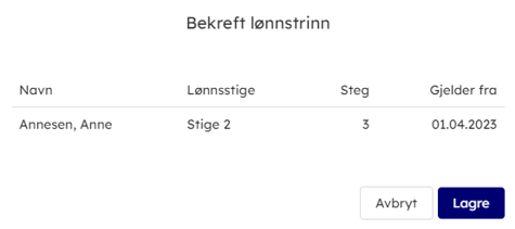 - Når man så trykke Lager vil man få frem oversikt over dato neste trinn gjelder fra, og status i prosent til man avanserer til neste steg i lønnsstigen.