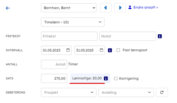 - Når man legger på lønnspost for timelønn får man se hvilket tillegg den ansatte har basert på lønnsstigen.
