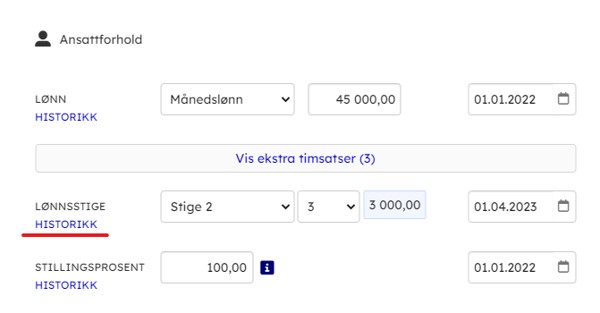 - På ansattkortet - Ansattforhold - Lønnsinformasjon ser man oversikt over lønnsstige, steg og sats. Her kan man også se historikk.