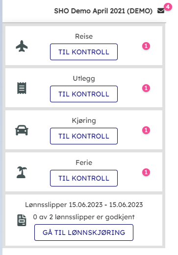 - Ansatte self-service elementer som er “sendt til godkjenning”. Reise og utlegg, ferie, timeføring (lønnsmodul).