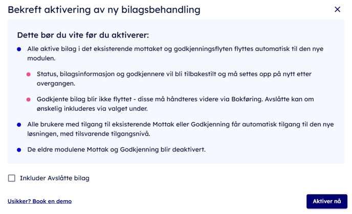 - Du får opp en introduksjonsside for modulen. Du må være brukeradministrator i klienten for å kunne aktivere, og har tømt det gamle mottaket for pågående bilag.