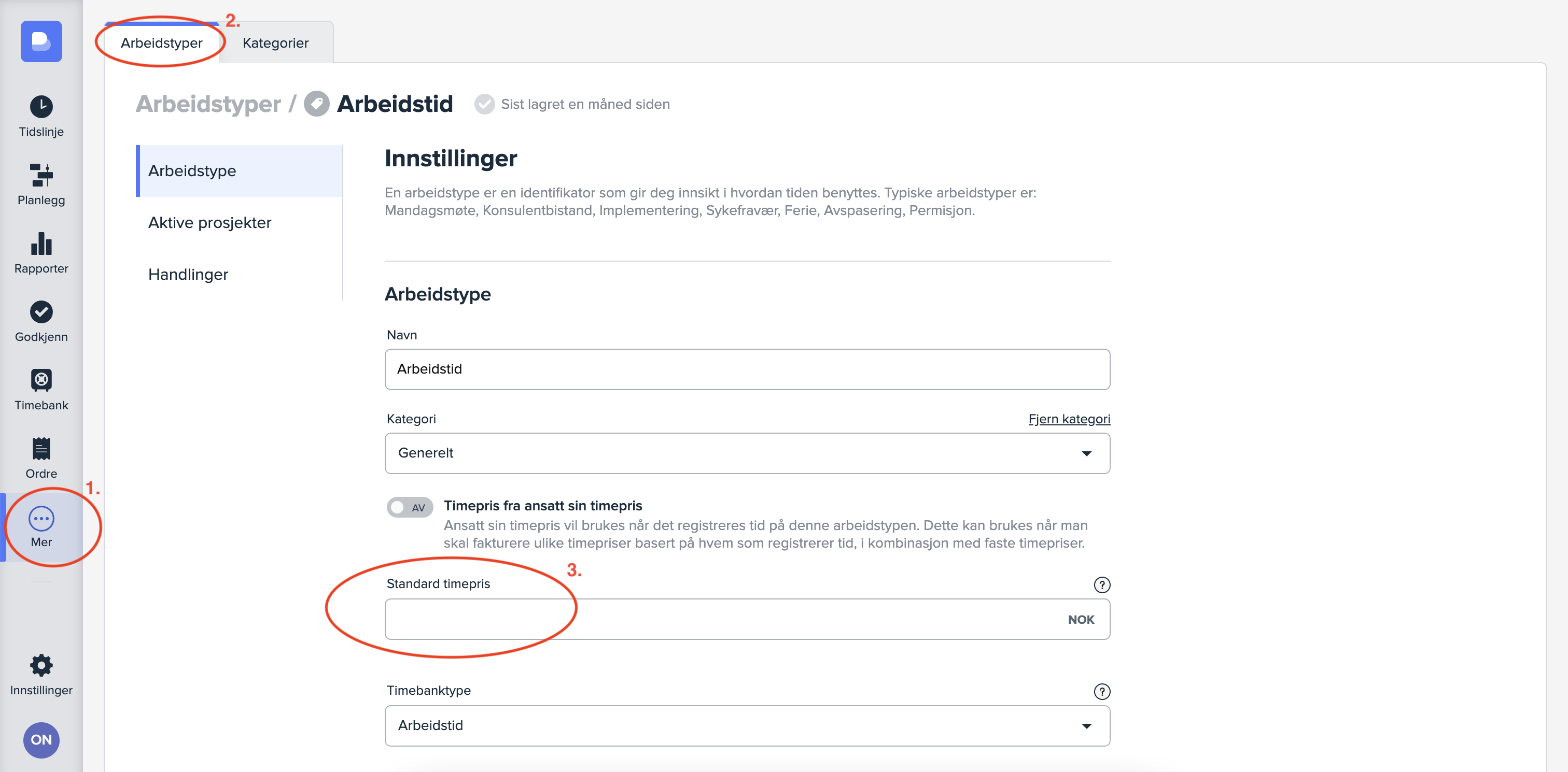 2. Standardiserte timepriser på arbeidstyper. Timeprisen du setter som standard på arbeidstypen når den opprettes. Dersom du har et prosjekt med timepriser spesifisert per arbeidstype, vil Busy ta utgangspunkt i den standardiserte timeprisen på arbeidstypen når denne legges til på prosjektet. Denne kan også overstyres per prosjekt.