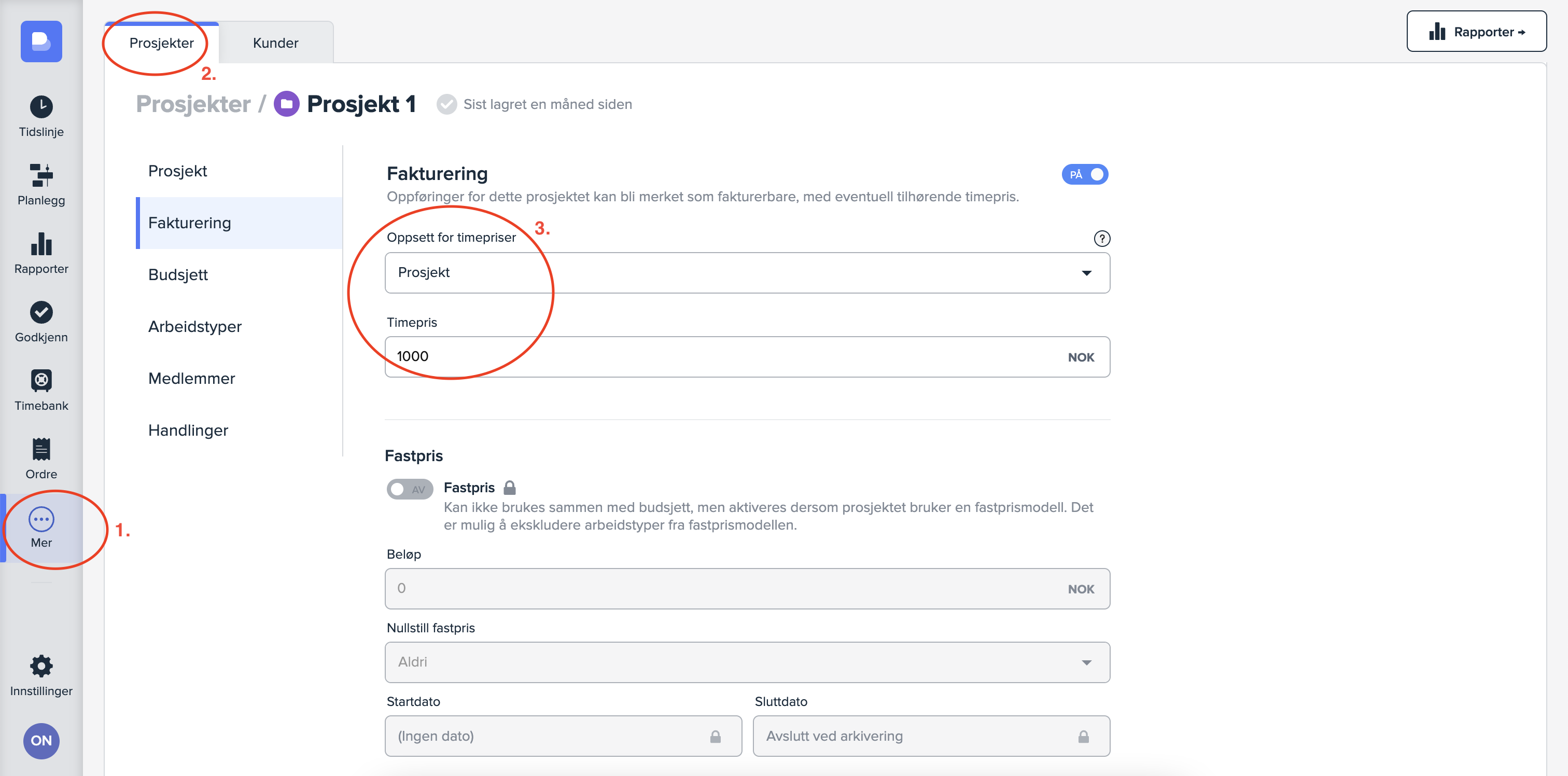 Merk: Dersom dere ikke har spesifisert en standard timepris for selskapet, vil den automatiske timeprisen på prosjektet stå som «0 kr».