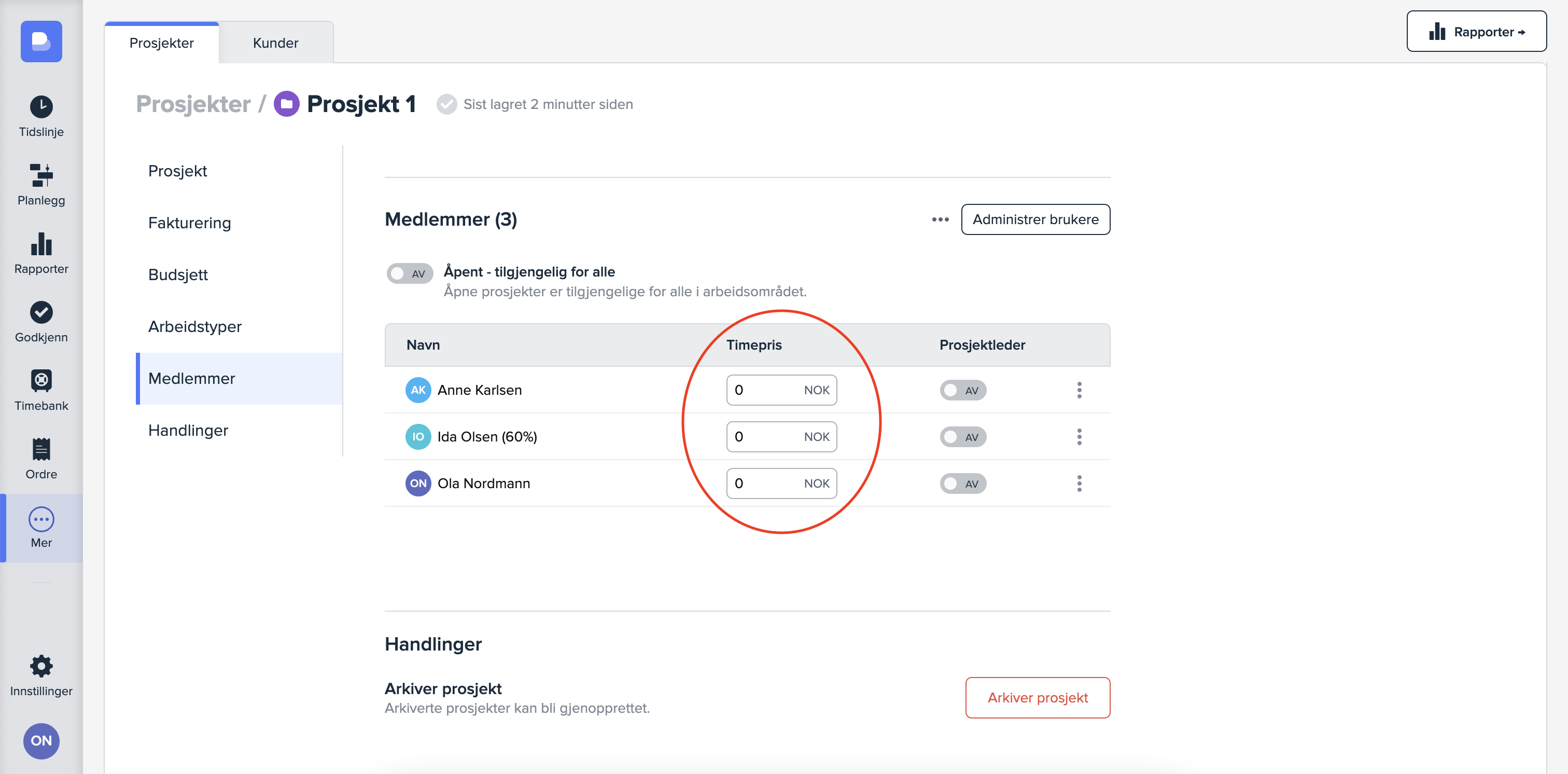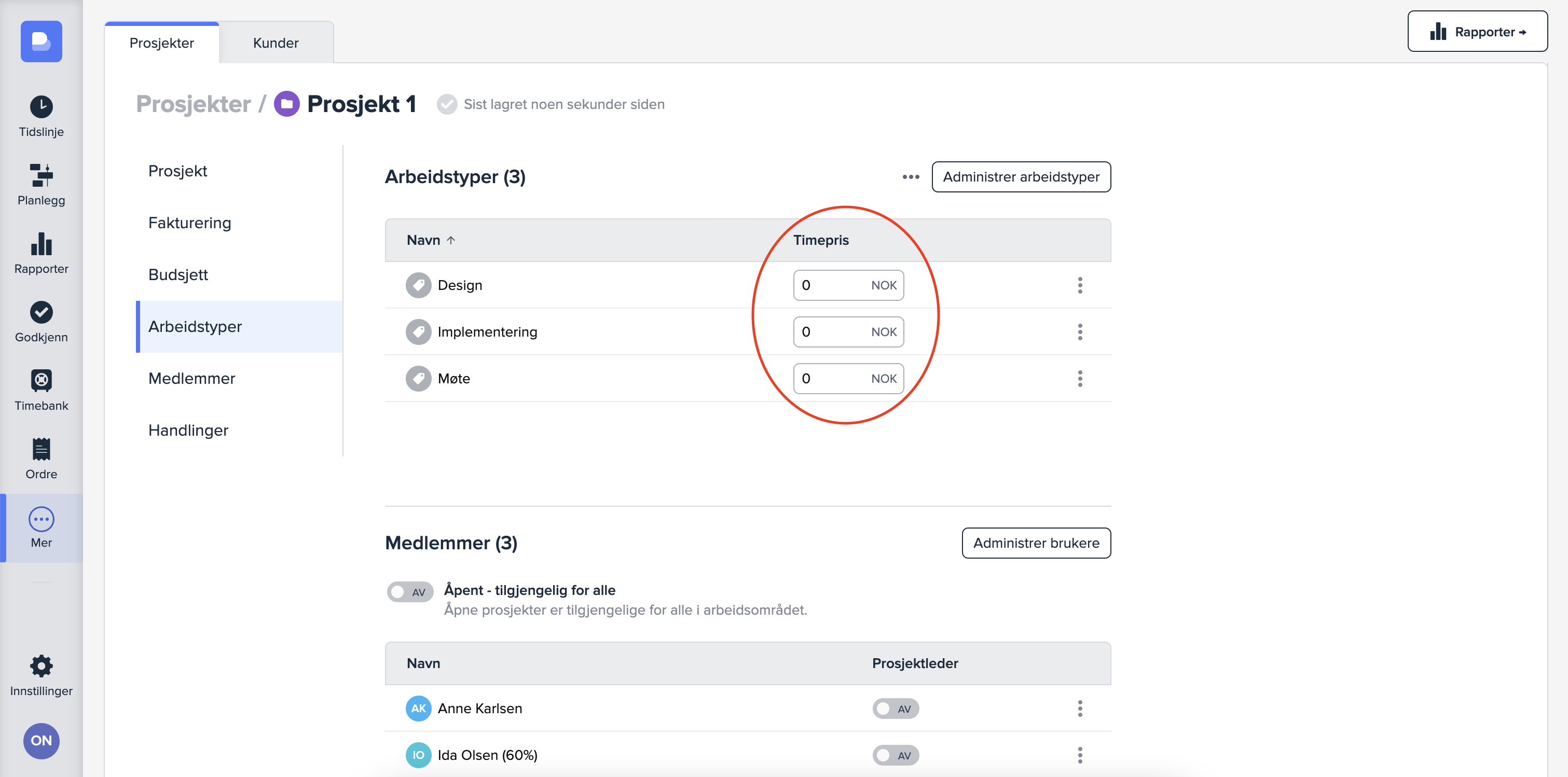 Dersom du har ansatte som skal ha ulik timepris på samme prosjekt, vil det være nyttig å sette opp timeprisen etter brukere. Du vil få opp en kolonne ved siden av navnet på brukerne som heter «Timepris».