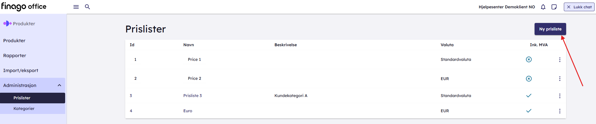 - For å benytte prislister, må man først opprette en ny prisliste. Dette gjøres ved å gå til Dashboard → Produkter → Administrasjon → Prisliste for deretter å klikke på “Ny prisliste".