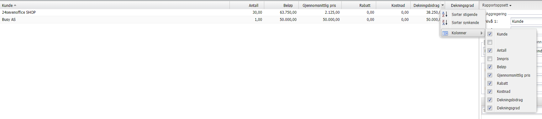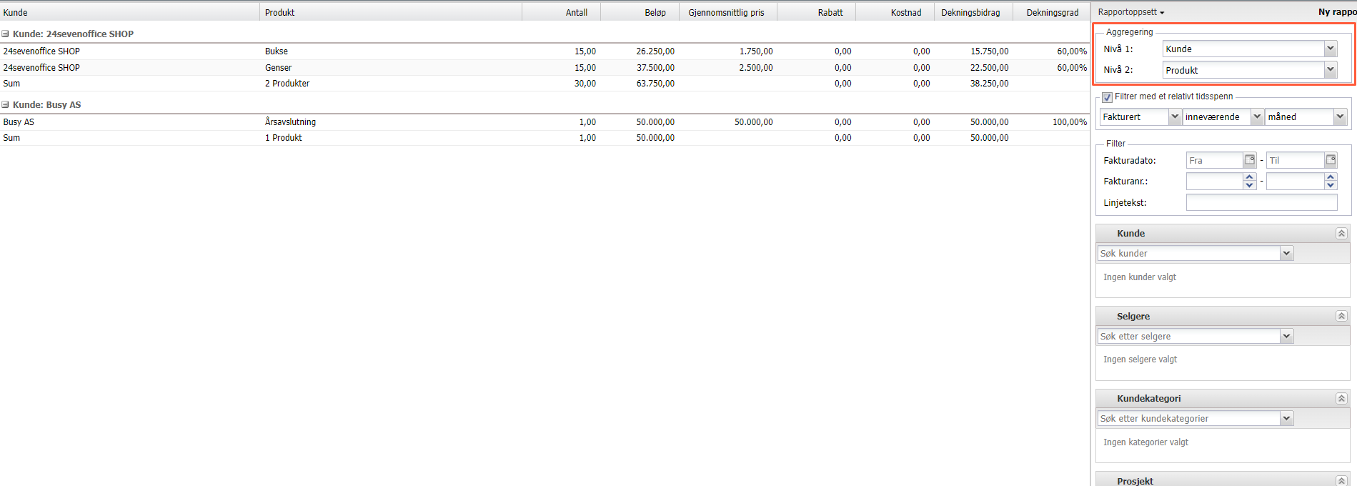 Rapporten for produktsalg gir deg en oversikt over alle solgte produkter med mulighet for ulike selekteringer. Her ser vi nærmere på hvordan vi kan aggregere denne.