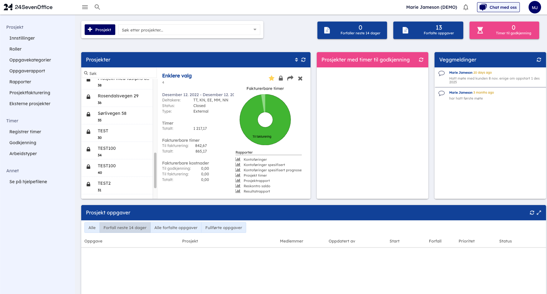 På denne siden har vi samlet informasjon om det aktuelle prosjektet slik at du med en gang skal få et raskt overblikk på prosjektet i det du åpner det. Du finner bla. en Vegg hvor du kan legge inn beskjeder til dine prosjektdeltakere, en oversikt over oppgaver/avtaler, samt linker til diverse andre funksjoner og rapporter.