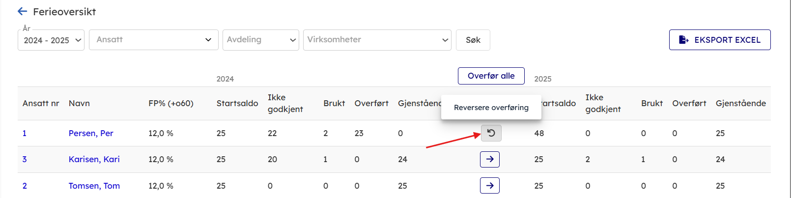 Har man overført feriedager, og man ønsker å angre overføringen, er det mulig ved å trykke på knappen for "Reversere overføring".