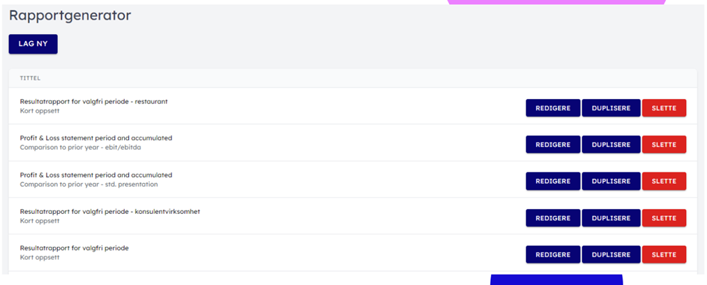 I Rapportgeneratoren har du muligheten til å lage helt nye rapporter, eller gjøre egne tilpasninger til forhåndsdefinerte rapporter.