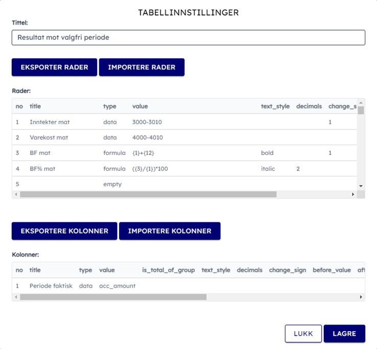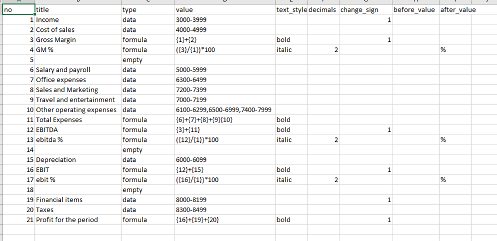 Måten man gjør tilpasninger på er at tabellene for en rapport eksporteres til excel. I excel redigerer man da Navnet på linjen, hva slags data som ligger på linjen (formel/dato/tom) osv.