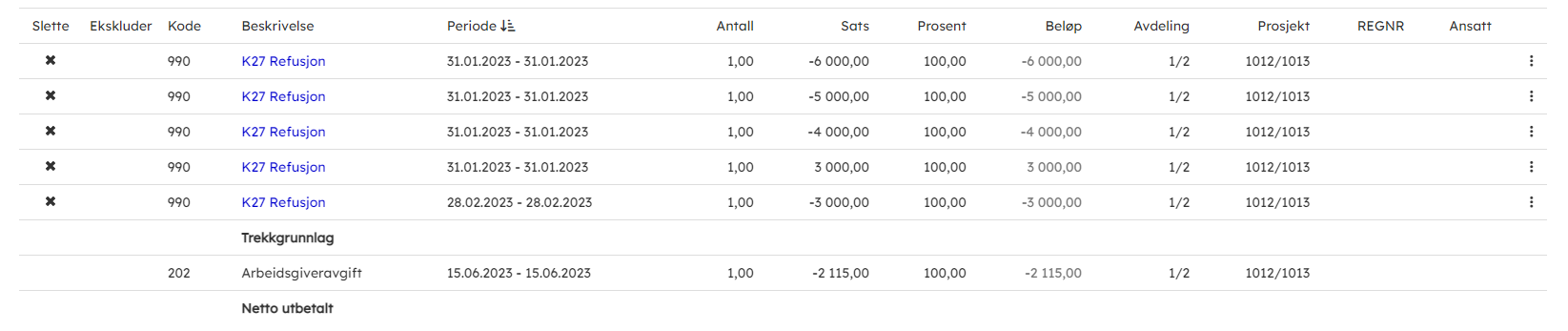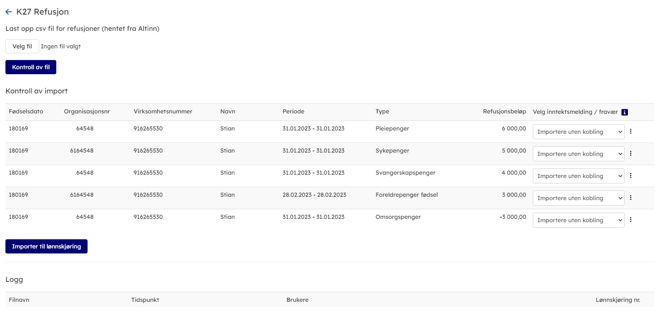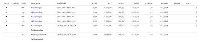 - Klikk importer til lønnskjøring. Lønnsposter med lønnsart 990 - K27 Refusjon opprettes på de ansatte. Dette er en lønnspost som ikke vises på lønnsslippen som standard. Formålet med refusjon er reduksjon av arbeidsgiveravgiften.