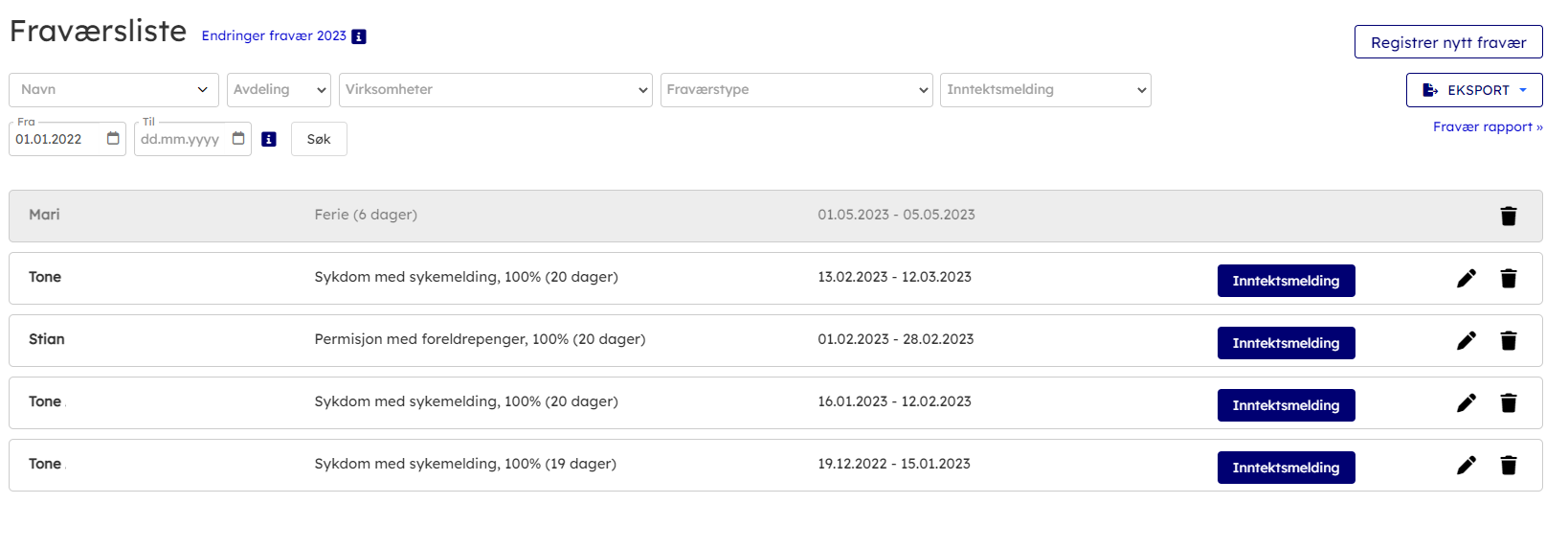 Fra fraværliste kan man sende inntektsmelding som blir grunnlaget for refusjon man søker etter. Prosessen med digital inntektsmelding dekkes ikke i denne artikkelen, men kan leses om her .