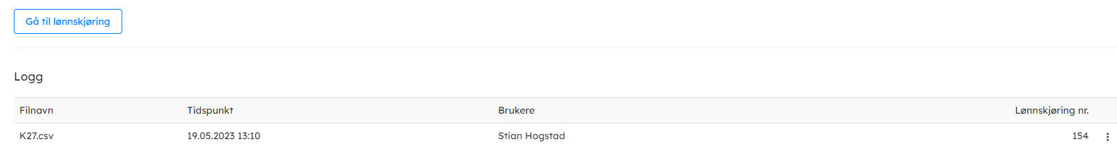 - Gå til lønnskjøringen ved å klikke på knappen under. Legg merke til at filen som er importert lagres i loggen. Fra 3 prikker menyen kan man slette refusjoner som ikke er lønnskjørt i aktiv lønnskjøring.