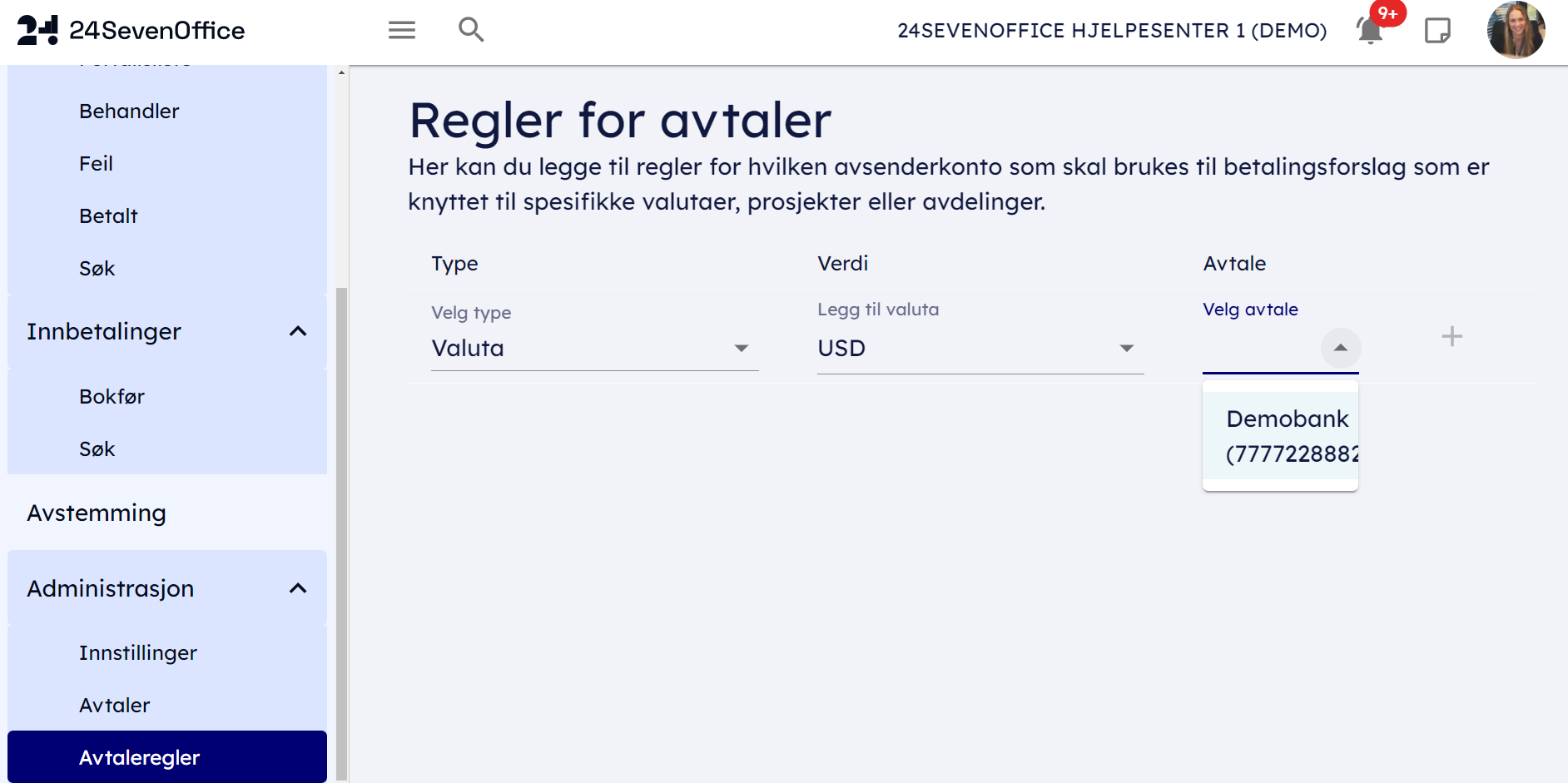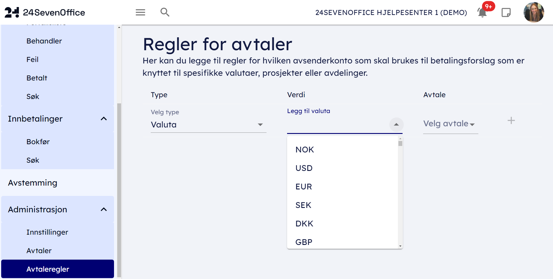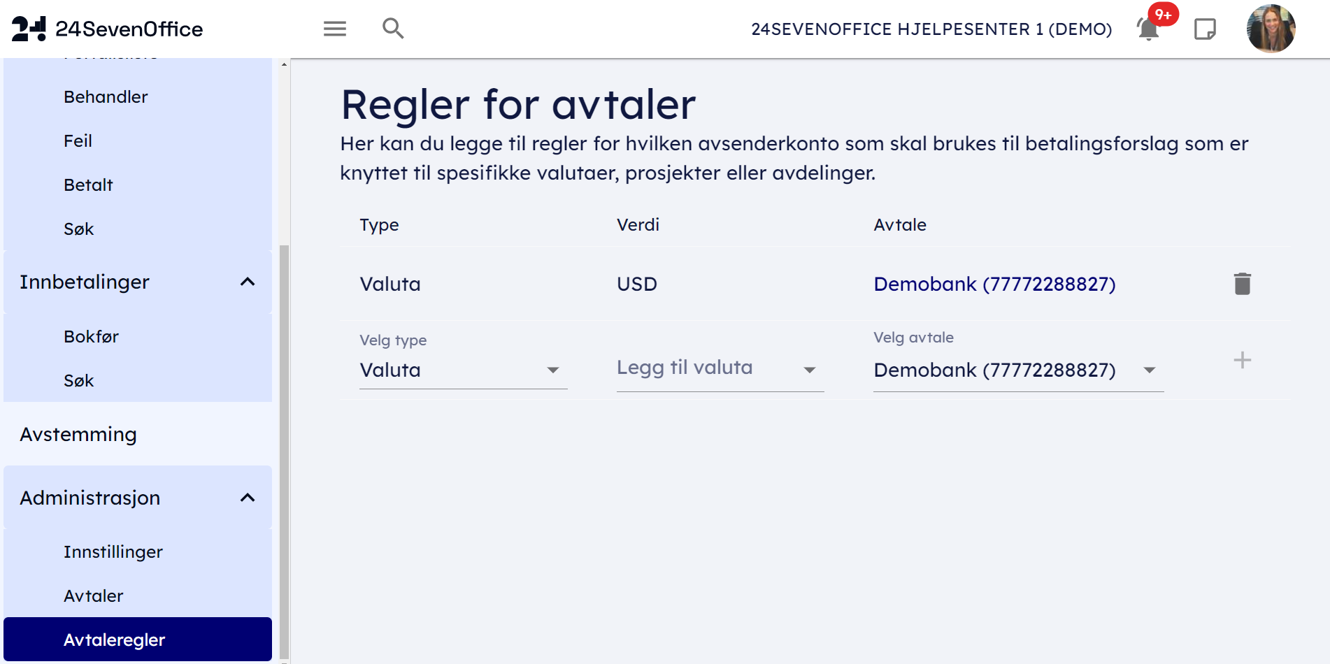Dersom dere har flere bankavtaler, har dere mulighet til å sette på regler tilhørende de ulike bankavtalene. Dere har da mulighet til å ha regler knyttet til prosjekt, avdeling, valuta eller leverandør.