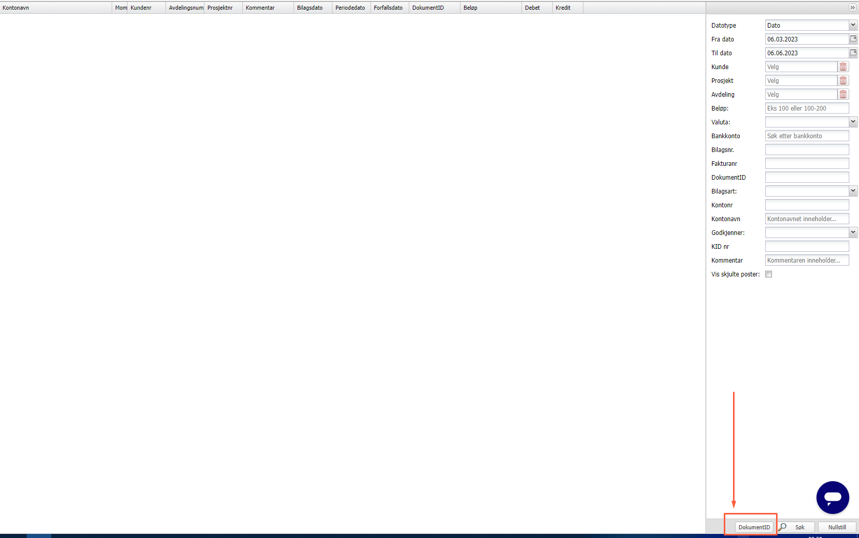 Gjør et søk i søk bilag på en eller flere av søkeparameterne på høyre side. - Når du har gjort et søk kan du klikke nederst i søkemenyen på dokumentID.