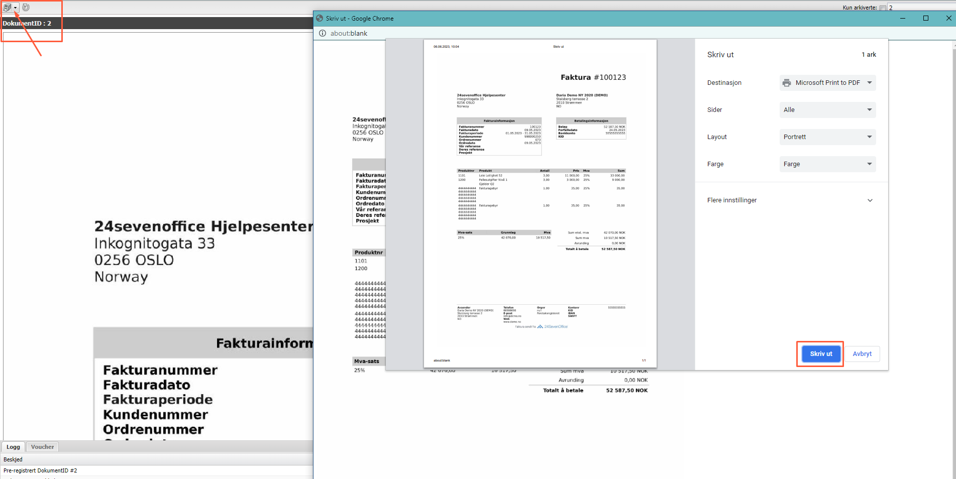 Om du ønsker å skrive ut dokumentID/fakturaen kan du gjøre det ved å søke opp ønsket dokumentID og klikk på skriveren øverst i venstre hjørnet og velg logg, da får du frem utskriftsvinduet. - Øverst i høyre hjørnet kan du velge å søke på ett dokumentID eller flere.