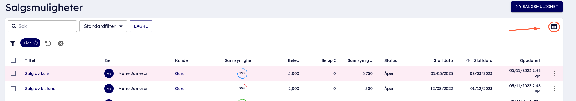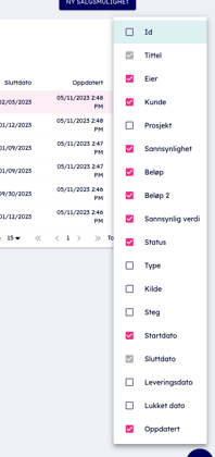 I salgsmuligheter har du muligheten til å velge hvilke kolonner du ønsker å se øverst til høyre på siden. Systemet husker hvilke kolonner du har valgt, slik at du slipper å velge dem på nytt neste gang du logger inn på 24SevenOffice-klienten.