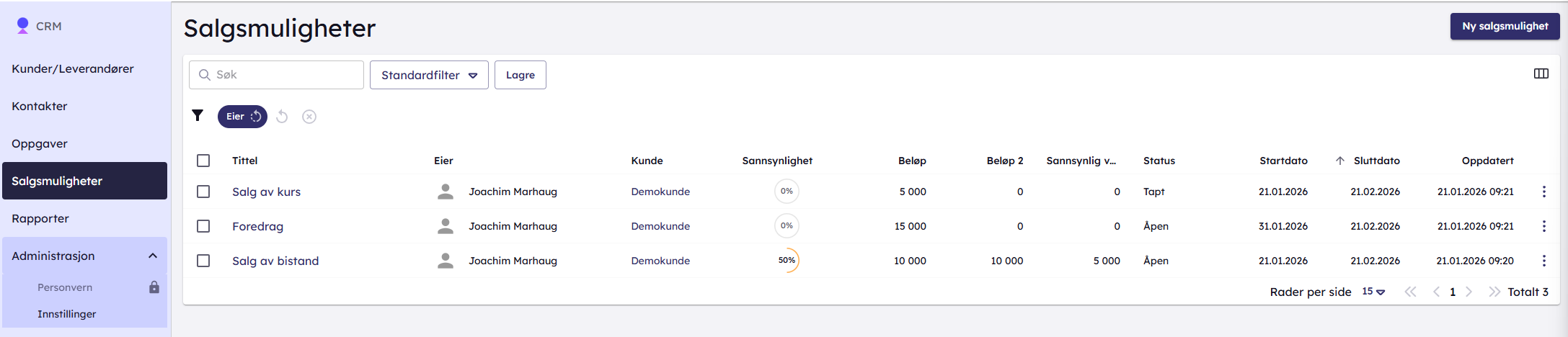 Du kan få tilgang til alle registrerte salgsmuligheter ved å klikke på "Salgsmuligheter" i venstremenyen inne i CRM modulen.