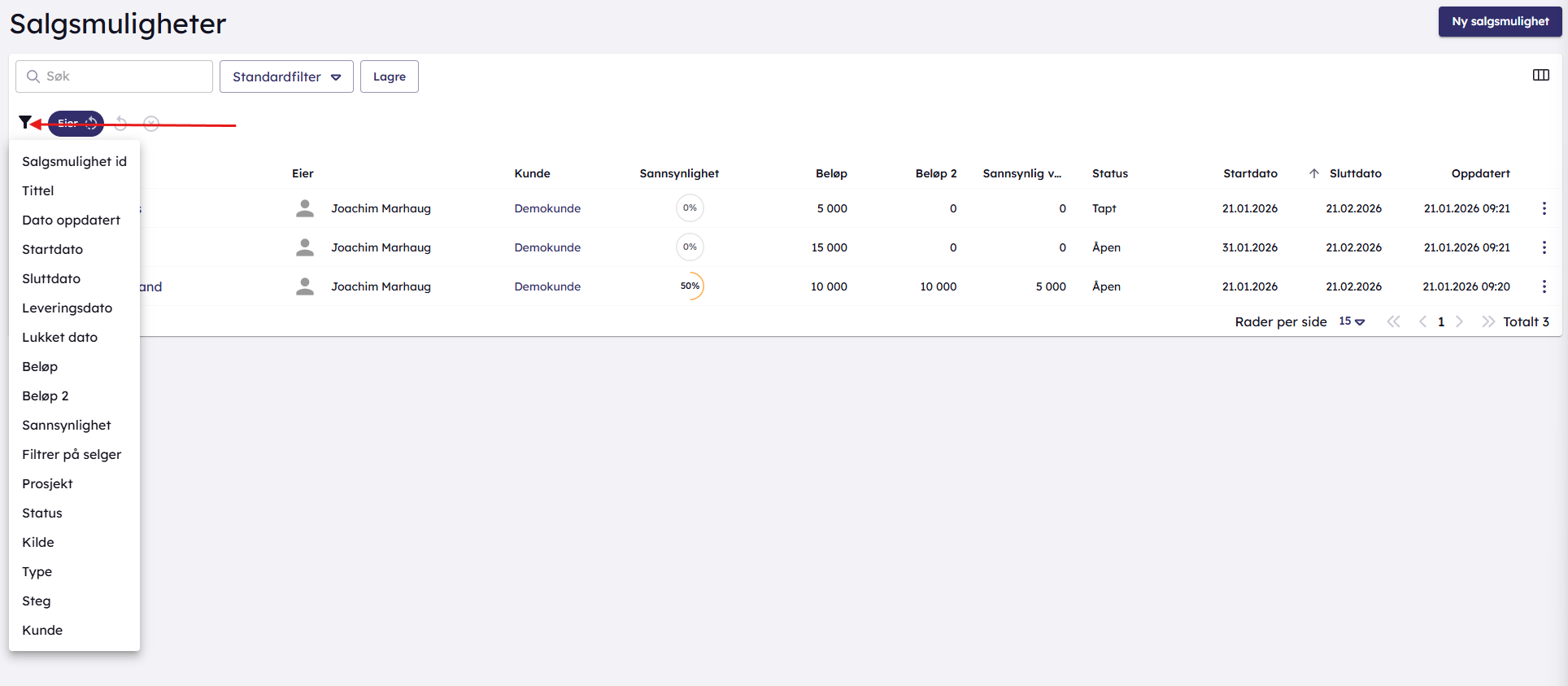 Ved å bruke filtrering kan du for eksempel raskt finne åpne salgsmuligheter for en bestemt selger, salgsmuligheter innen en gitt periode eller muligheter knyttet til en spesifikk kunde eller et prosjekt.