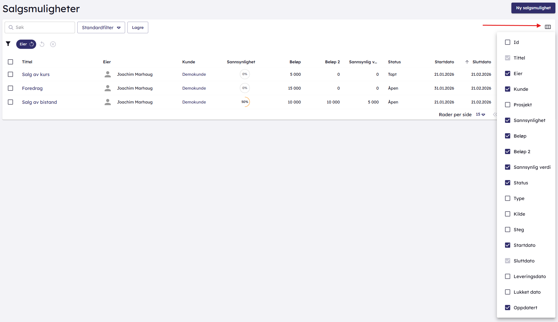 I oversikten over salgsmuligheter kan du selv velge hvilke kolonner som skal vises. Dette gjør du ved å klikke på kolonnevelgeren øverst til høyre på siden. Systemet lagrer valgene dine automatisk, slik at de samme kolonnene vises neste gang du logger inn i Finago Office.